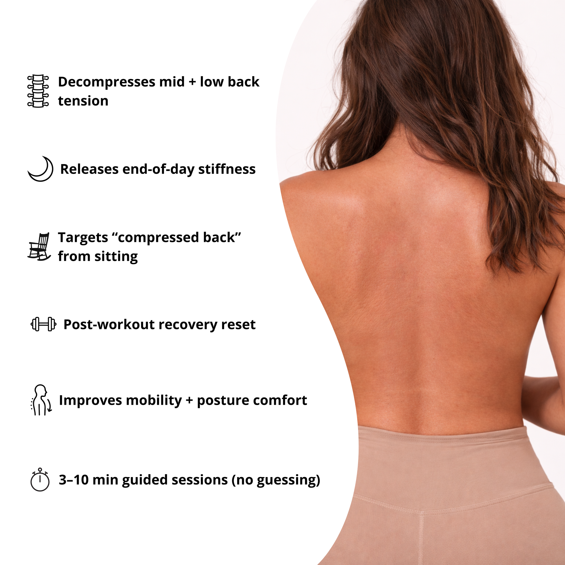 Mid and lower back compression. Postural tension from long sitting. Post-workout muscle tightness. The locked feeling that makes it hard to fully relax.